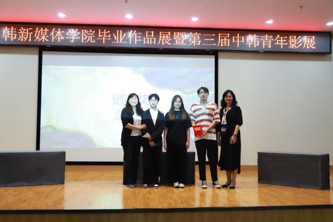 教务部副部长邓松、中韩新媒体学院党委副书记刘晓燕为获奖学生颁奖