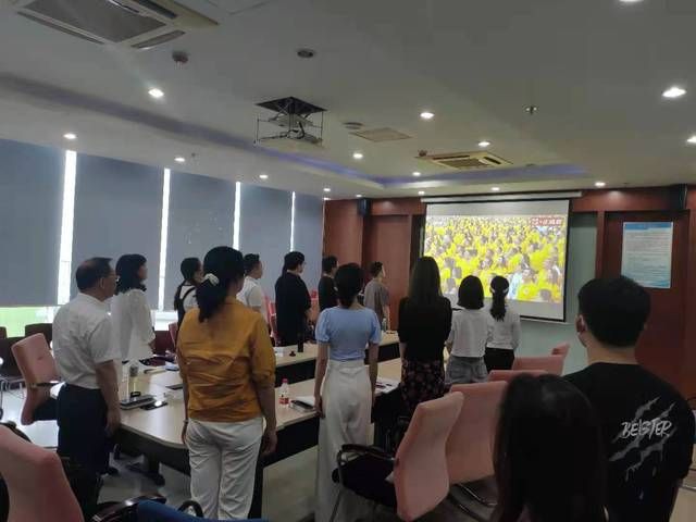 8:00,李克强总理宣布成立庆祝中国共产党成立100周年大会正式开始。全体肃立,56门礼炮,鸣100响,致敬党的光辉历程。 222名仪仗队队员组成的国旗护卫队护送国旗到达。在场教职工齐唱国歌,国旗在雄壮的国歌声中徐徐升起。