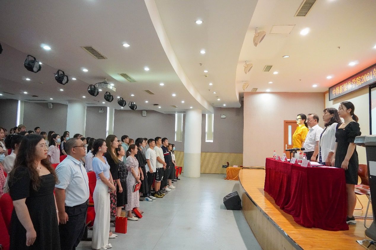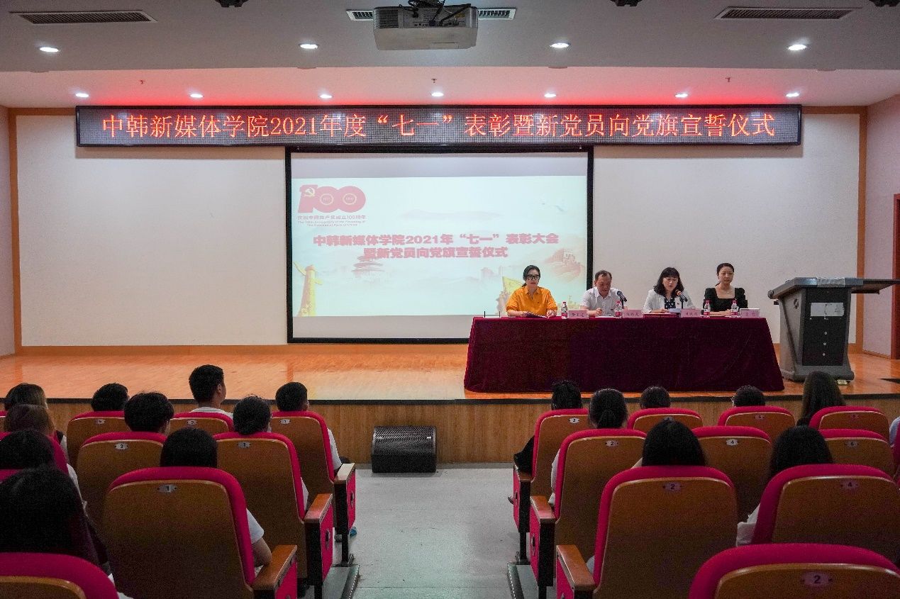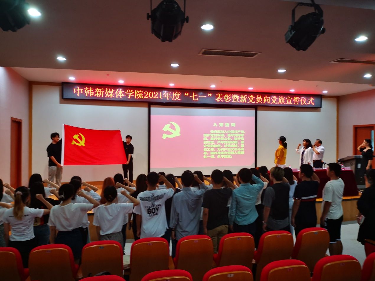 新闻网讯(通讯员 毛承东)百年征程照初心,奋楫扬帆启新程。为庆祝中国共产党成立100周年,7月1日下午,中韩新媒体学院举行2021年度“七一”表彰大会暨新党员向党旗宣誓仪式。学院党委班子成员、全体师生党员参加了仪式,仪式由学院党委副书记刘晓燕主持。