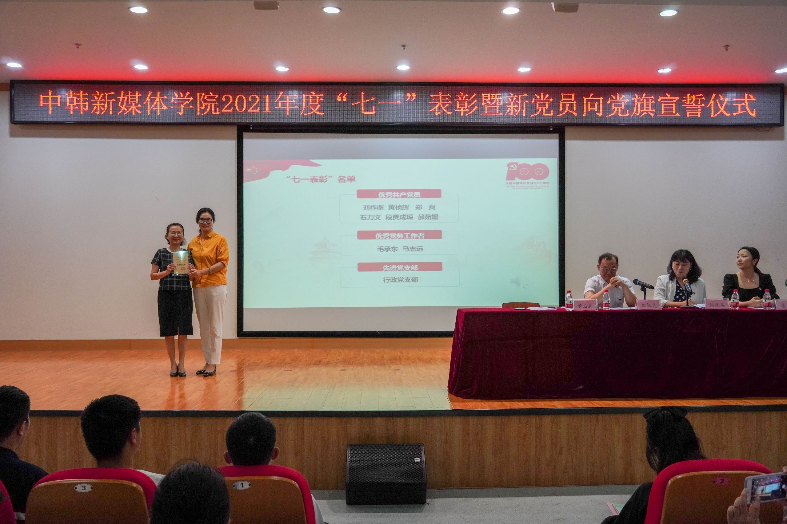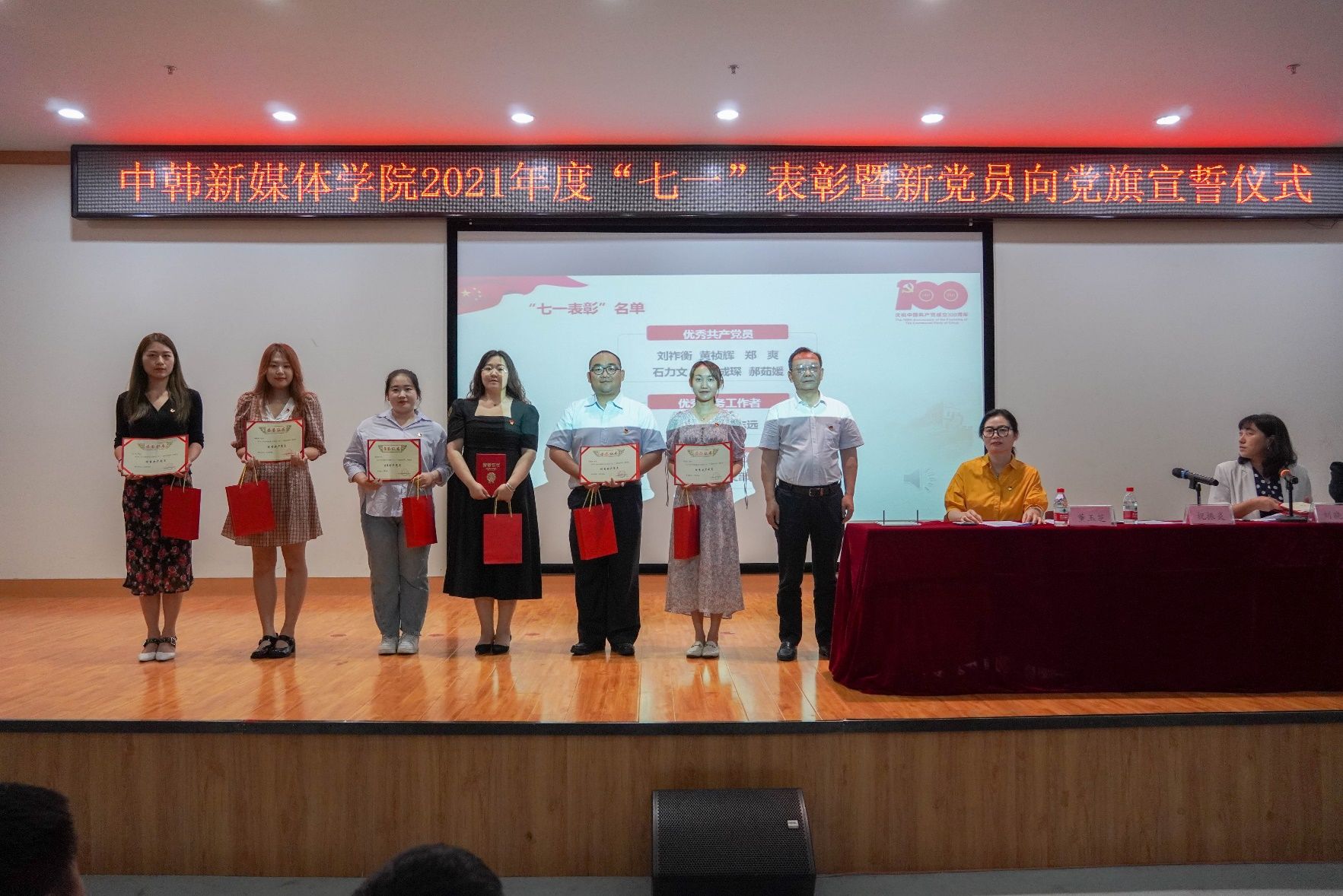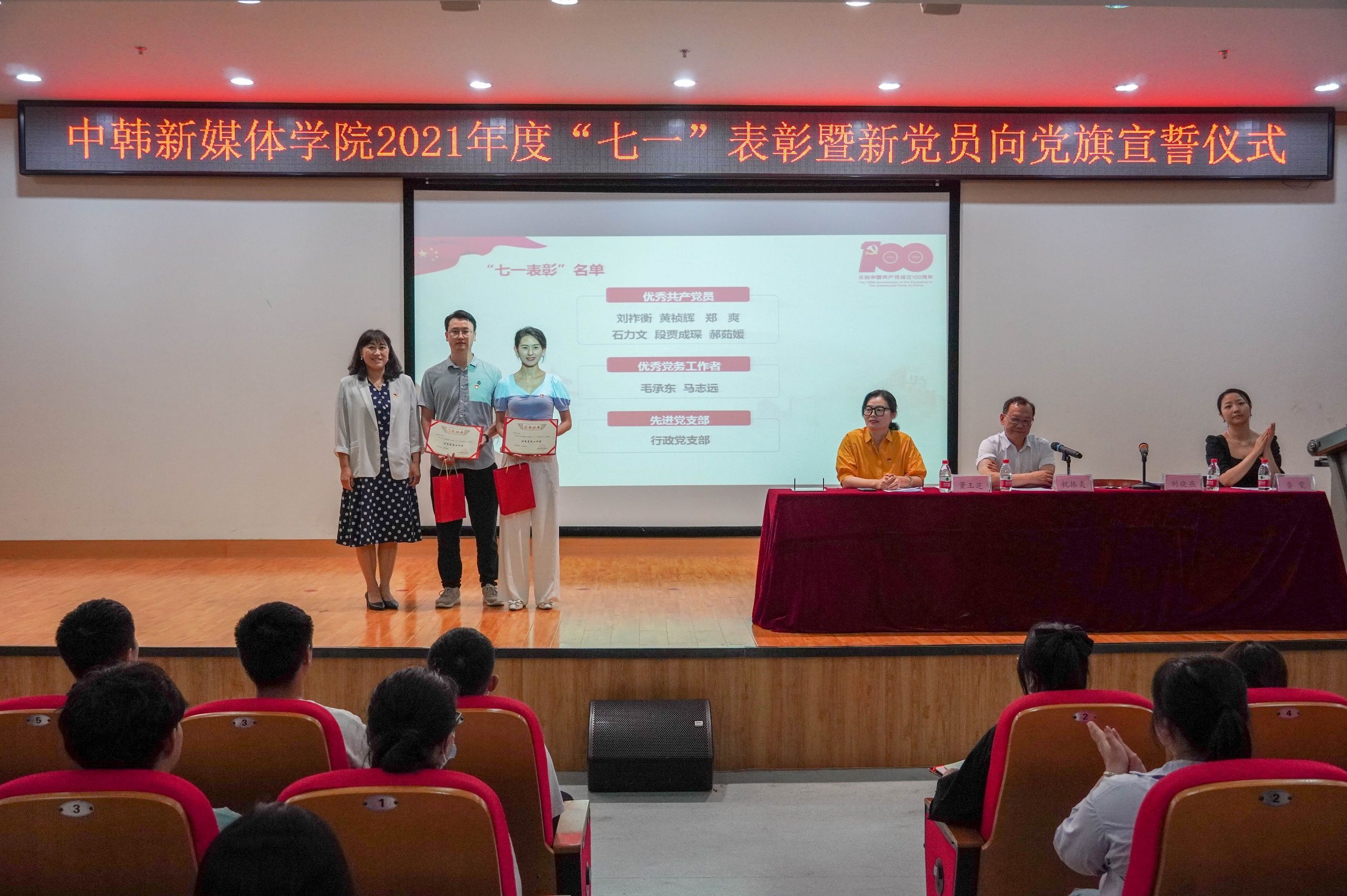 新闻网讯(通讯员 毛承东)百年征程照初心,奋楫扬帆启新程。为庆祝中国共产党成立100周年,7月1日下午,中韩新媒体学院举行2021年度“七一”表彰大会暨新党员向党旗宣誓仪式。学院党委班子成员、全体师生党员参加了仪式,仪式由学院党委副书记刘晓燕主持。