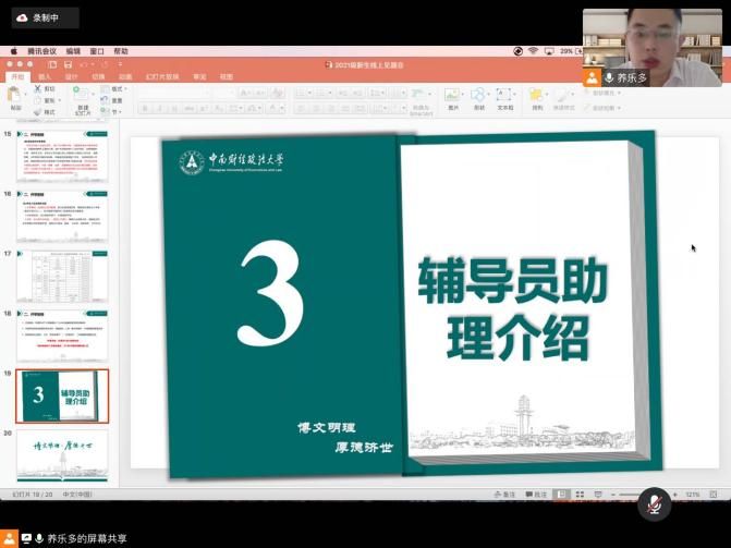 最后,8名辅导员助理与所带新生“云见面”,并依次进行自我介绍。他们均表示会尽职尽责为新生提供帮助和服务,同时鼓励21级新生要珍惜大学时光,努力学习,抓住新机遇,勇敢面对新挑战。