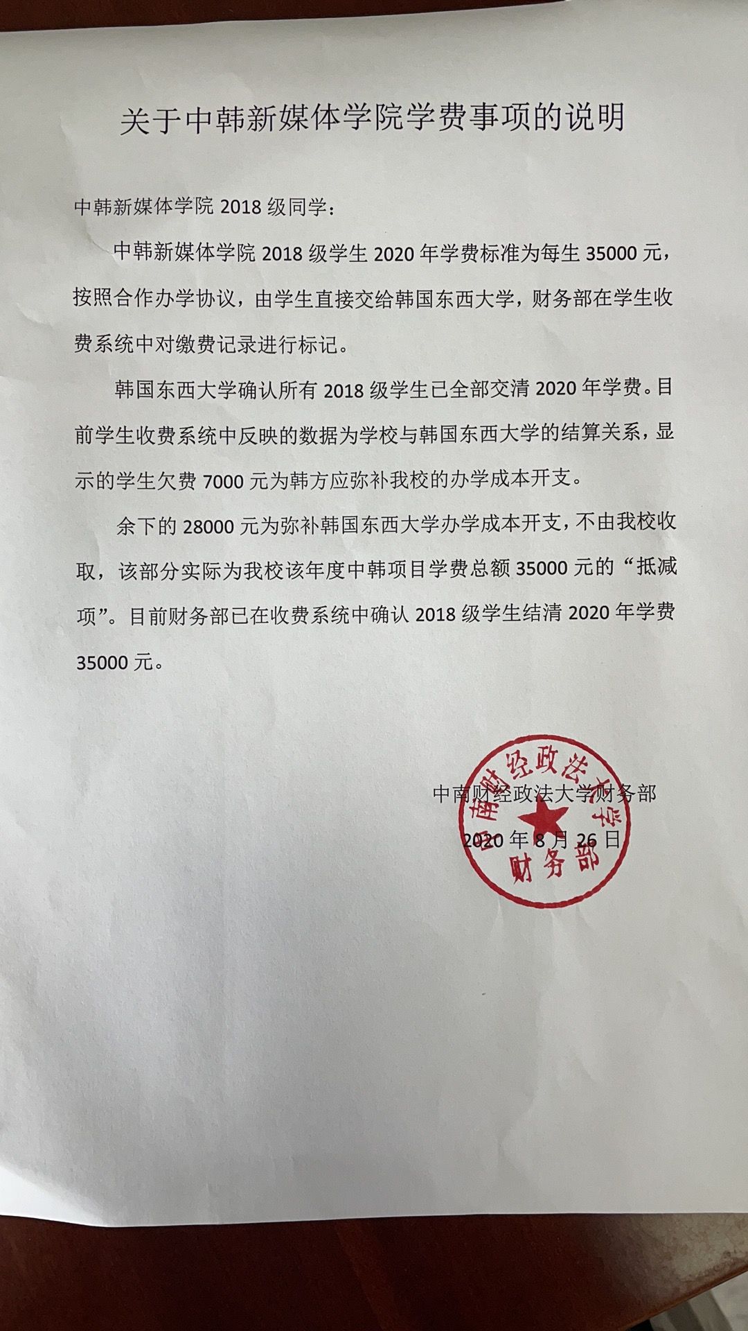 关于学生“校园统一支付平台”显示的“减免金额”28000元学费的信息,学院已经就此问题与学校财务部沟通,并让财务部作出具体说明。财务部出具了“关于中韩新媒体学院学费事项的说明”,财务说明附后。