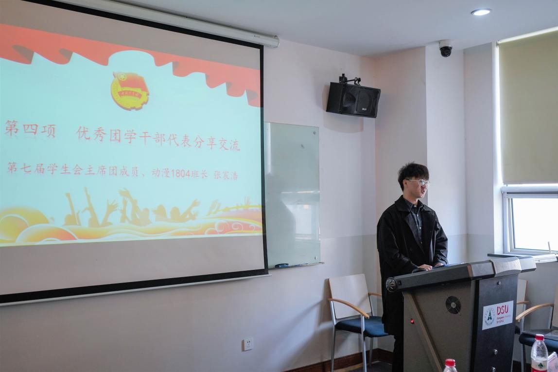 院学生会第八届主席团成员张欣代表学生会做工作汇报。张欣简要介绍了过去一年来院学生会组织举办各项活动的情况,总结了工作成果并提出未来展望,希望所有的团学干部能够在实践工作中不断吸取经验,开拓创新,推动我院团学工作更进一步。优秀团学干部代表、院学生会第七届主席团成员张宸浩也就团学干部如何平衡好学习和学生工作的关系以及如何发挥好团学干部的先锋模范作用等方面发表了自己的心得体会。