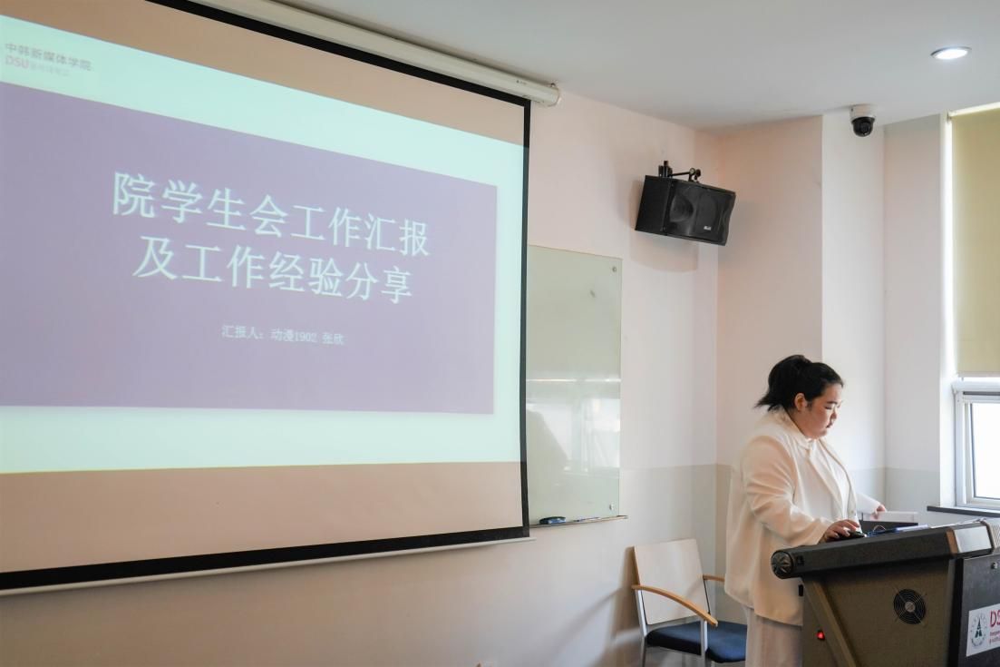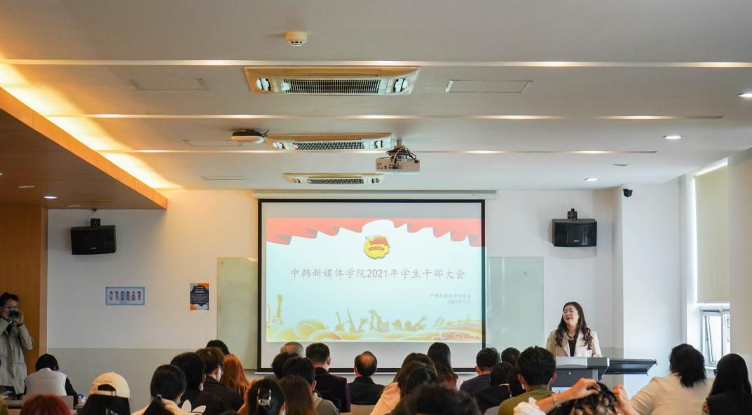 (新闻中心讯 通讯员:贺久桓 袁迪)11月18日下午14时,中韩新媒体学院2021年学生干部大会在文济楼312教室举行。学院党委书记祝振炎,韩方院长金彦河,党委委员、副院长赵博雅,党委副书记、纪委书记徐明,院党委委员、副院长董玉芝以及各年级辅导员出席会议。出于疫情防控需要,会议分为线下线上两个会场,学院团学组织主席团成员及2021级各班班长团支书线下参会,其他各年级学生干部参加线上会议。本次大会由院团委书记黄祯辉主持。