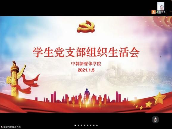 (新闻网讯 通讯员 王立源)2022年1月5日下午4点,中韩新媒体学院学生党支部开展2021年度组织生活会和民主评议党员工作,联系学生支部院领导董玉芝副院长、支部全体党员参加,会议由尤志兵同志主持。