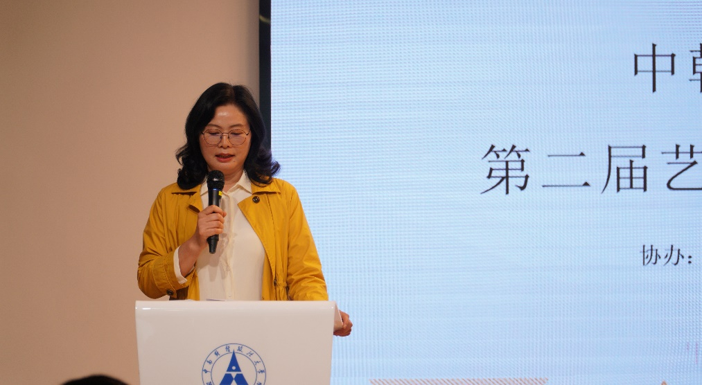 副院长董玉芝介绍了本次展览的概况,中韩新媒体学院在中南财经政法校团委学习发展中心的大力支持下,一是践行中南大“美育”思想。以美为媒,通过艺术创作,丰富同学们的校园文化生活,涵养同学们的审美内涵;二是提升专业实践。“以展促学”,优秀作品进行展示和交流,真正起到朋辈引领、学习借鉴的促进作用,营造良好的学风。