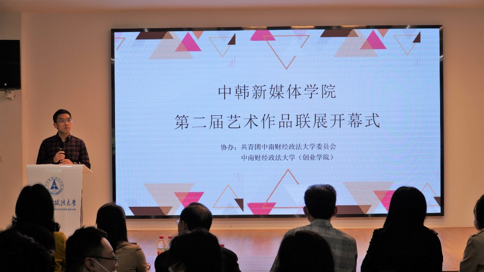 副院长董玉芝介绍了本次展览的概况,中韩新媒体学院在中南财经政法校团委学习发展中心的大力支持下,一是践行中南大“美育”思想。以美为媒,通过艺术创作,丰富同学们的校园文化生活,涵养同学们的审美内涵;二是提升专业实践。“以展促学”,优秀作品进行展示和交流,真正起到朋辈引领、学习借鉴的促进作用,营造良好的学风。