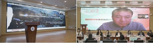 开幕式结束后,中韩新媒体学院副院长赵博雅主持会议主题发言。清华大学文科资深教授、清华大学美术学院原院长鲁晓波教授提出,现代传播已经离不开数字影像的传播,教育也随即在发生变化,“从传统的传道授业解惑,已经变成了发现问题、提出问题、解决问题。”北京电影学院教授、《北京电影学院学报》主编吴冠平教授认为“作为艺术的数字影像,它的功利性、隐喻性、历史性让今天的数字影像依然具有艺术特征,数字影像依然可以成为人类精神获得很重要的一种方式。”中国传媒大学研究员、博士生导师张国涛教授简述了中国影视产业近二十年来取得的辉煌成就和当下面临的生存挑战,总结了当前影视剧创作存在的四个问题,并提出“辩证处理主旋律与多样化创作、发展温情现实主义、高度重视网生内容、构建内地市场与境外市场双循环格局”四点对策建议。中国艺术研究院电影电视研究所副所长、研究员孙承健教授从主体—位置的理论视角切入,对于技术所形塑的人类观看之道进行了阐释,指出通过数字技术与数字媒体,创构出一个由数据、算法与图像所构建起的虚拟世界是新的趋势。韩国东西大学尹泰洙教授就AR/VR技术赋能元宇宙空间扩张以及基于元宇宙界面认知的基础上还原VR/AR技术本质,这一组相向互驱的对应关系进行了系统阐释。中央新闻纪录电影制片厂朱勤效副总经理从自身经历出发,介绍胶片和数字技术用于影像记录的优劣势,以及数字时代历史影像的开发和使用。他提倡“在数字时代,这些珍贵的历史影像内容更是我们国家和民族的共同文化记忆,让我们把这些珍贵的文化资产守护好、开发好、利用好。”