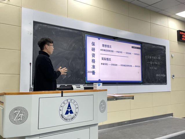 郭名扬就学术保研的相关信息,分别从保研前的准备工作、保研流程、个人保研经历以及申请策略与心态调整四个方面展开介绍,为到场的师弟师妹们做了十分详尽的讲解。与此同时,他也清晰地介绍了学术保研的整个流程以及各阶段所要做的准备,结合自己的经历在文书制作、个人材料准备等方面都提出了相关建议。最后,郭名扬同学告诉在场的师弟师妹们,保研是一场持久战,要及时调整好心态。