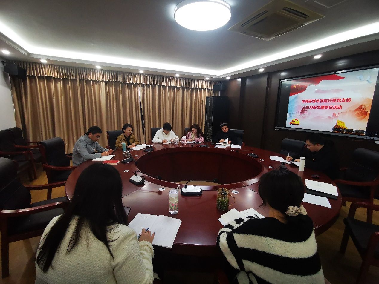 为深入学习贯彻党的二十届二中全会精神和2023 年全国两会精神,中韩新媒体学院行政党支部于323日在文济楼411会议室开展了 “学思践悟新思想,团结奋斗开新局”主题党日活动,活动由行政党支部书记施芸芸主持,支部全体党员参加了学习。院党委副书记、纪委书记徐明在活动中给全体党员讲授党课。