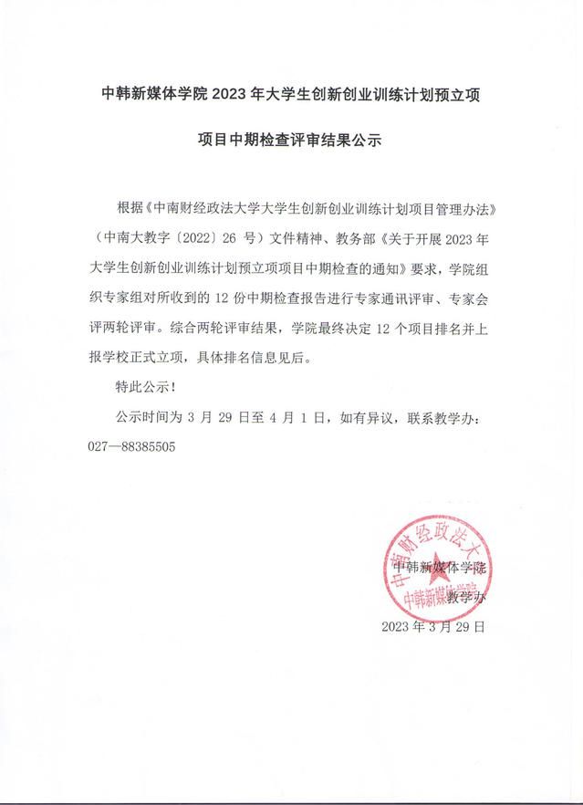 中韩新媒体学院2023年大学生创新创业训练计划预立项项目中期检查评审结果公示