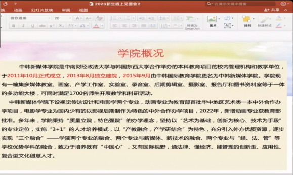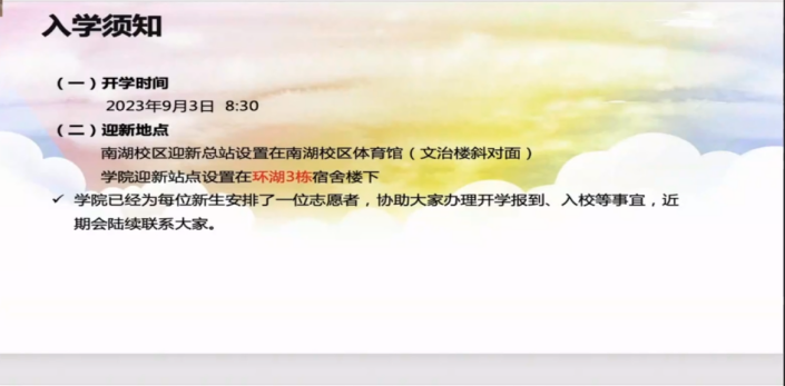 2023年8月31日下午3点,中韩新媒体学院全体2023级新生在线上参与新生迎新会,主讲人为2023级辅导员王沐老师。