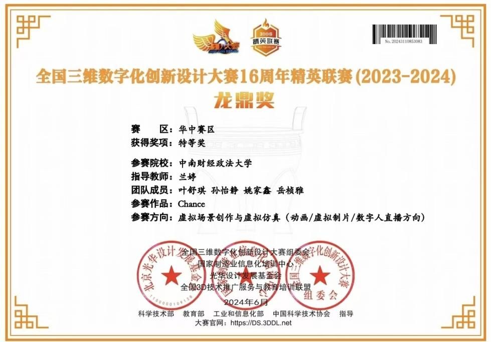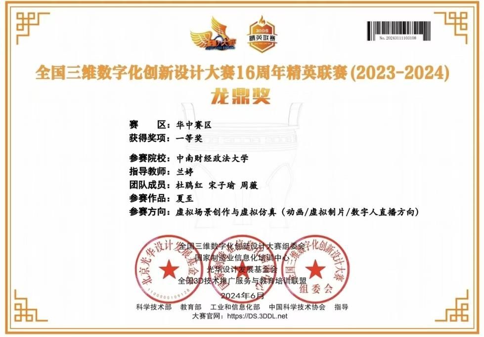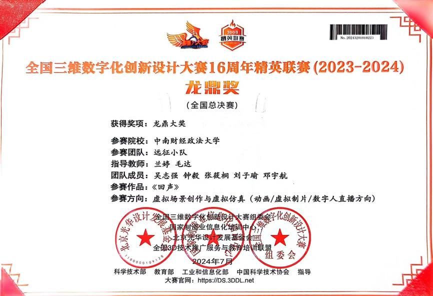 由兰婷、毛达老师指导的吴志强团队入围该项赛事最高奖——“龙鼎大奖”争夺赛。该团队48小时现场命题作品《回声》,以深刻的立意、流畅的叙事和工业级的视觉效果从众多竞争对手中脱颖而出,勇夺离线动画制作方向全国总冠军。兰婷、毛达老师荣获“优秀指导老师”称号。