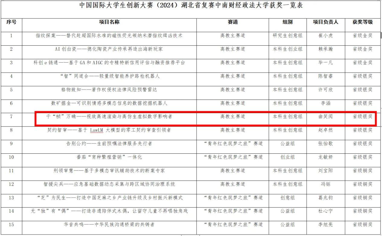 2024年7月29-30日,由湖北省教育厅主办的中国国际大学生创新大赛(2024)湖北省赛在湖北工业大学举行并圆满落幕。大赛湖北赛区采用校级初赛、省级复赛二级赛制。在各校初赛基础上,我校共15支队伍入围省级复赛。其中来自中韩新媒体学院的“千‘帧’万确——视效高速渲染与高仿生虚拟数字影响者”项目斩获省级银奖的佳绩。
