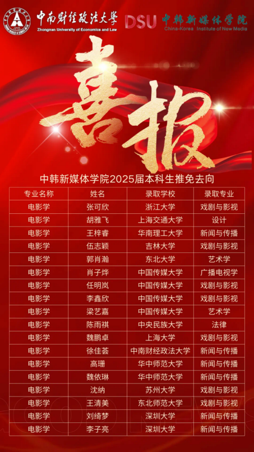 近日,2025年全国各大高校推荐免试硕士研究生拟录取名单陆续公布,学院喜报频传,中韩新媒体学院今年获得推免指标34人,学院高度重视,周密组织,充分体现了公开、公平、公正的原则。最终,电影学专业18人,视觉传达设计专业16人,均以优异的学业成绩和全面的综合素质成功推免至国内知名高校。