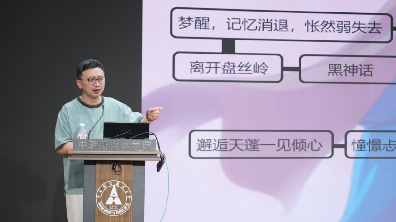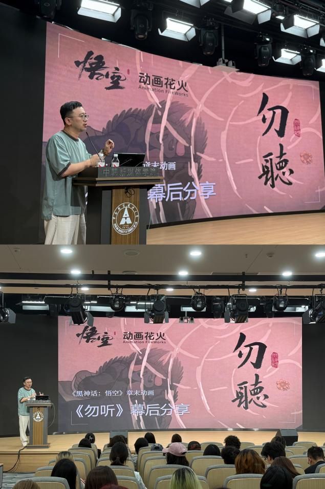 (通讯员:涂焰、杨茜唯)6月12日晚,绿怪研创始人、大火鸟制片人、动画花火主理人黄骅莅临中韩新媒体学院201大讲堂举办“《黑神话:悟空》章末动画《勿听》幕后分享”讲座。讲座由祁璇副教授主持,赵博雅副院长(主持行政工作)和学院百余名师生到场聆听。