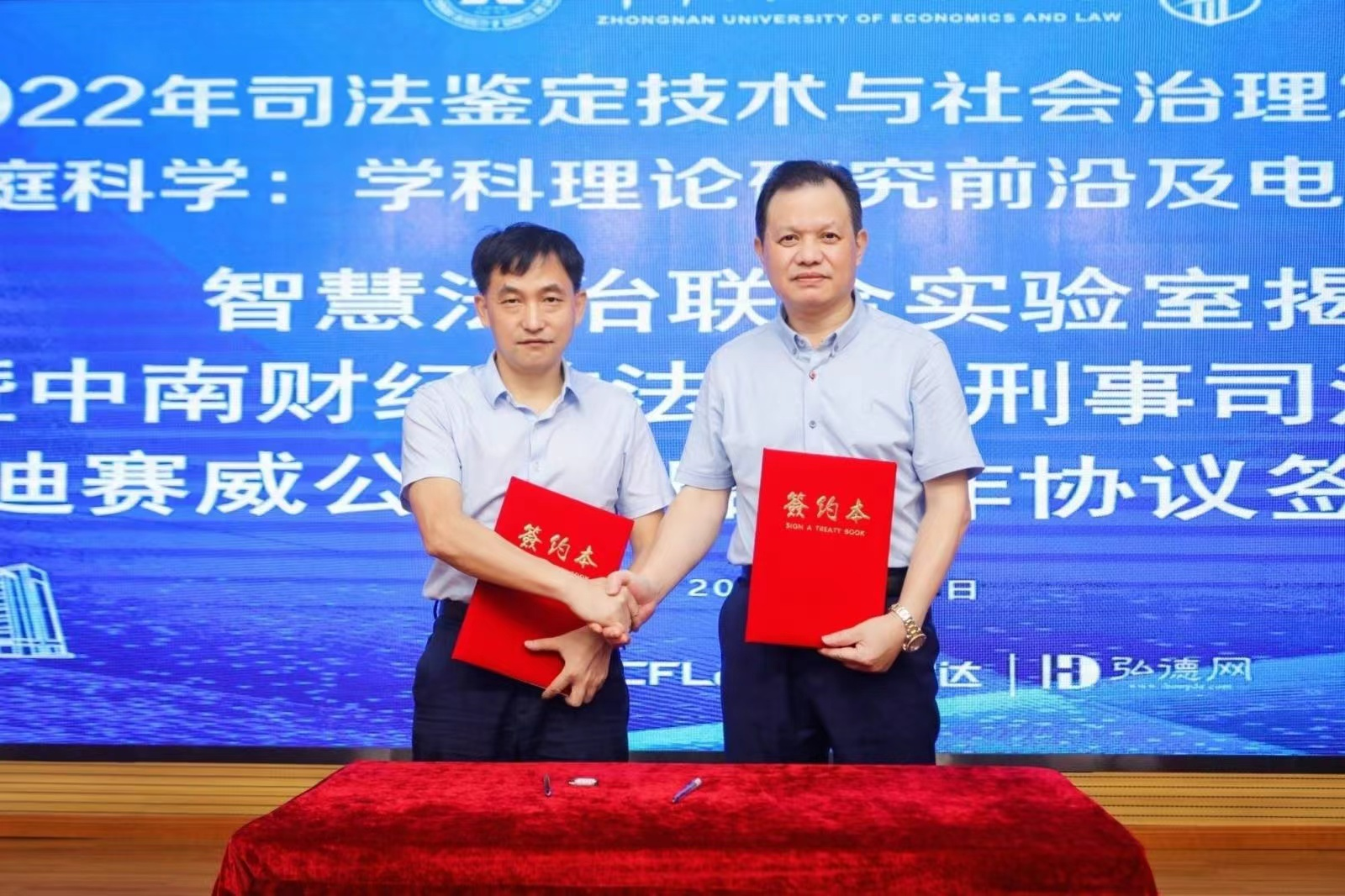 开幕式最后,研讨会举行刑事司法学院与迪赛威公司的战略合作协议签约仪式,并由校领导和迪赛威公司代表黄袭丰为-智慧法治联合实验室-揭牌。-智慧法治联合实验室-的成立聚焦法庭科学,回应社会需求,引领法庭科学研究的新方向,进而服务国家法治建设。