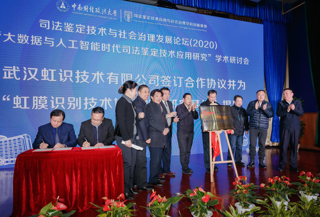 随后,校党委书记栾永玉教授、副校长闫平教授、副校长姚莉教授、赵成文教授、杨宗辉教授、刘新涛副局长等共同开启了基地的门户网站“中南司法鉴定网”,标志着中南司法鉴定中心的发展迈入了服务社会、共享资源的新阶段。接着,司法鉴定技术应用与社会治理学科创新基地项目招标公告发布仪式中,胡向阳介绍项目招标公告,并与武汉虹识科技公司签订合作协议。栾永玉、闫平、姚莉、徐汉明等专家学者共同为“虹膜识别技术协同创新研究基地”揭牌。
