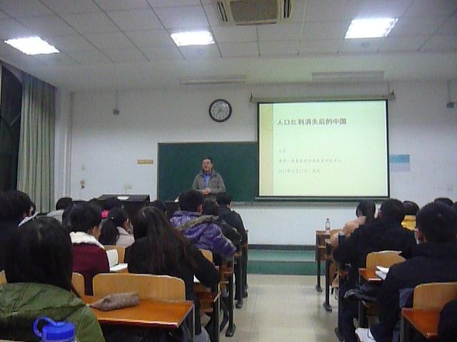 (学生记者 赵清雅)2012年12月11日晚7点,清华—布鲁金斯公共政策研究中心的主任王丰教授在我校文波楼111教室进行了以“人口红利消失后的中国”为题的学术讲座。众多老师和学生均参加了本次讲座,现场十分火爆,座无虚席。