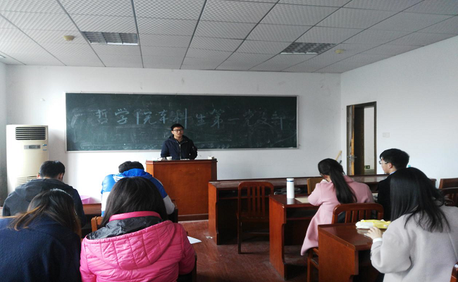 3月2日下午,哲学院本科生第一党支部在文沛二楼212教室举行支部主题党日活动。这次党日活动的主题为“学习贯彻全国高校思想政治工作会议和有关文件精神,学习传达2017年教育系统党风廉政建设工作视频会议精神”。支部全体成员参加了此次会议。