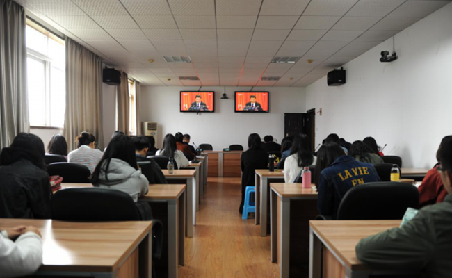 上午8点半,同学们陆续到达会议室,有序地入座后,一同观看网络实时采访直播。9点整,党的十九大开幕会正式开始,全体支部成员起立、唱国歌,歌声嘹亮,气氛雄壮。随后,支部全体成员全程倾听了习近平总书记的报告。