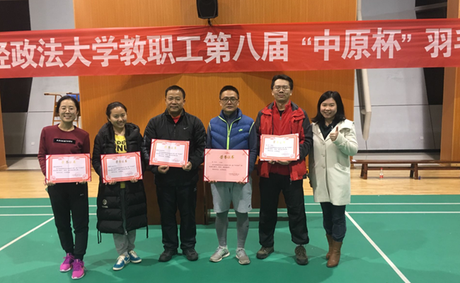 (学生记者 杨雅莉 摄影 黄娟) 12 月7 日下午,我院教职工羽毛球队参加了校第八届“中原杯”羽毛球比赛决赛。我院运动员奋力拼搏,大展风采,战绩赫赫——笪宁、谢志鹏(工商管理学院)喜获男双项目第一名,高碧峰、刘海波(马克思主义学院)获男双项目第五名,笪宁、李万全分别获男单项目第四和第五,陈意萍、王路芳获女双项目第七名。哲学院工会获“最佳组织奖”。