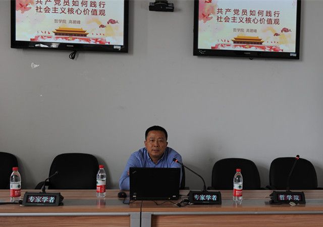 高碧峰书记首先向大家介绍了社会主义核心价值观的提出背景及发展历程,具体讲解了社会主义核心价值观的基本内容及其科学内涵。随后高书记指出,社会主义核心价值观中的“富强、民主、文明、和谐”集中体现了中国共产党人的奋斗目标和历史责任,“自由、平等、公正、法治”是中国共产党人的执政理念和执政方式的体现,“爱国、敬业、诚信、友善”是中国共产党人的基本价值追求与行为准则。最后高书记强调,共产党员要模范践行社会主义核心价值观,必须坚定对共产主义和中国特色社会主义的理想信念,必须加强共产党人的党性修养,必须坚守共产党人的精神追求、保持共产党人的道德情操,还必须彰显共产党人的人格力量。总之,积极培育和践行社会主义核心价值观,对于巩固马克思主义在意识形态领域的指导地位、巩固全党全国人民团结奋斗的共同思想基础,对于促进人的全面发展、引领社会全面进步,对于集聚全面建成小康社会、实现中华民族伟大复兴中国梦的强大正能量,具有重要现实意义和深远历史意义。共产党员在践行社会主义核心价值观中要起模范带头作用,深入学习理论知识,提升思想境界与道德修养,凝心聚力用实际行动来诠释社会主义核心价值观。