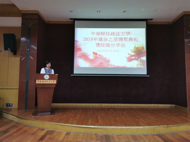 (学生记者:曹媛 毛一帆 张博愉)6月19日下午,2019年中南财经政法政法大学“就业之星”颁奖典礼暨经验分享会在文潭楼四楼报告厅举行。校就业指导与服务中心副主任向敏,哲学院学生办公室主任毛丹丹出席本次活动。
