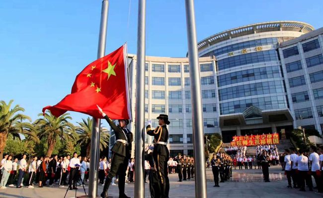 上午七时十分,微风拂面,红日初升,国旗护卫队迈着矫健的步伐,将鲜艳的五星红旗护送至升旗台下。伴随着激昂雄壮的国歌声,在全体师生的注目下,五星红旗冉冉升起,迎风飘扬。