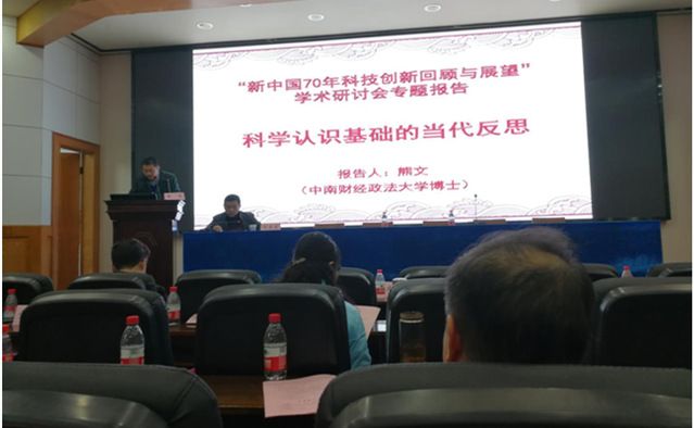 在开幕式上,研究会理事长刘建凡教授作了2019年工作总结和2020年工作规划。会议审核通过了研究会2019年工作报告和财务报告及新增研究会理事和常任理事的人选,熊文老师增选为理事。参会专家围绕“新中国70年科技创新与回顾”展开了热烈讨论,从多角度对新中国的科技事业进行了分析。海军工程大学的贲可荣教授作了题为《人工智能技术与安全》的主题报告,指出人工智能在当前许多行业得到广泛应用,我们更应关注应用人工智能技术所带来的伦理、哲学问题。熊文老师在会议中作了题为《科学认识基础的当代反思》的专题发言,简述了康德、胡塞尔、马克思等人在寻求科学确定性中所作的努力。熊老师指出,经验哲学坚信知识源于经验会导致怀疑主义,而康德吸取教训,旨在为自然科学知识奠定必然性基础做努力。胡塞尔在康德的基础上做了进一步努力,开创了现象学的方法,力图建立严格意义上的科学。马克思跳出了用思维解决思维问题、用认识解决认识论问题的圈子,立足于实践解决科学确定性问题,赋予科学知识以完美性、确定性和普遍性。本次年会的发言主题还涉及到“我国水资源管理总量控制与实践”、“新中国独立自主与开放相统一的科技发展道路”、“一般社会系统发展的一般方向”、“地学视野下的流浪地球”、“康德的超验逻辑”、“科学革命与科学创新”、“新中国70年科技创新与制度优势”和“社会类的本体论探纲”等。在会议闭幕式上,研究会表彰了本次年会评选出来的优秀研究生论文,并为获奖人颁奖,项晶晶和周艺君同学分别获得二等奖和三等奖。这是研究会第四次评选优秀研究生论文,前两次的优秀研究生论文已经结集出版。