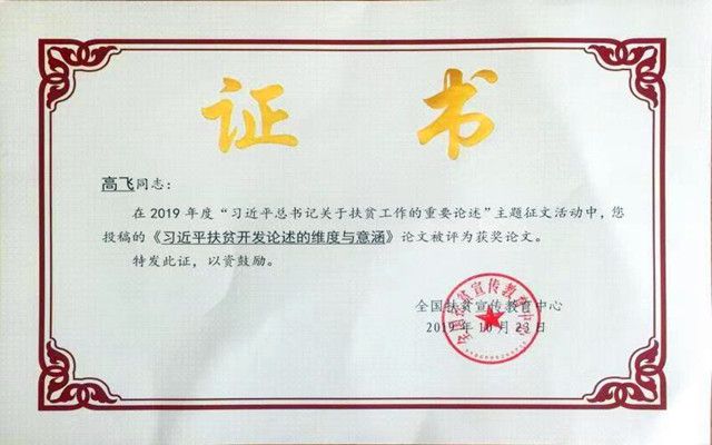 为不断深入学习习近平总书记关于扶贫工作的重要论述,交流研究成果,经国务院扶贫办批准,在国务院扶贫办综合司、 政策法规司支持指导下,全国扶贫宣传教育中心在全国范围内组织开展“学习习近平总书记关于扶贫工作的重要论述”主题征文活动。经过资格审查、专家初审、复审及办内审读等环节,我院高飞副教授的《习近平扶贫开发论述的维度与意涵》一文获奖,这也是我校仅有的两篇获奖论文之一。高飞副教授作为优秀代表受邀参加在京举办的习近平总书记扶贫工作重要论述理论研讨会,该论文编入《习近平总书记关于扶贫工作的重要论述学习文集》(2019)首篇,即将由中国出版集团研究出版社出版。