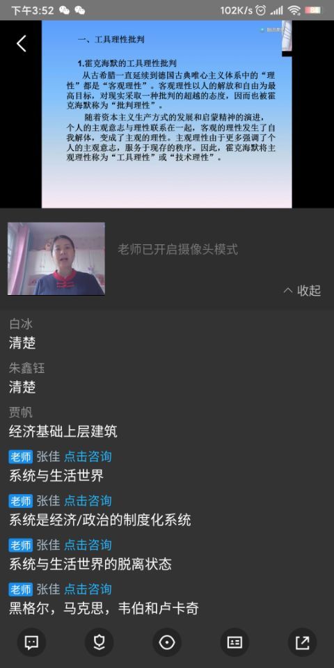 为了解决这一问题,进一步增强对教学效果的掌控,张佳老师通常会提前布置预习内容,上课时抽查学生预习情况;让学生在讨论区提出问题,自己及时进行解答;同时,要求大家课后整理笔记并发到群里,让同学们互相学习讨论。经过一个月以来的学习,同学们纷纷表示,已经逐步适应网络授课的节奏,接下来会更加积极主动参与到课堂的讨论中。