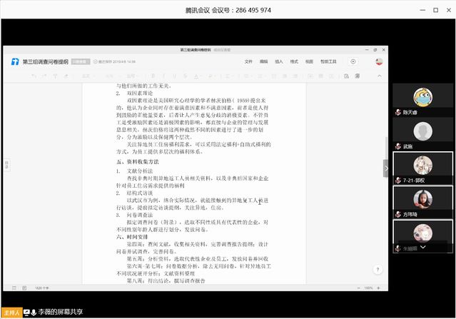 社会工作专业的李薇老师在本学期负责《员工福利》课程的讲授,这门课不仅要求学生要掌握一定的专业理论,而且要求学生通过问卷、访谈等形式,调查研究企业员工在疫情趋于平稳后复工复产过程中的福利需求,是一门实践性很强的课程。李薇老师选择超星学习通软件进行线上授课,教学过程中也遇到过网络信号质量不好的情况,有时会导致PPT无法正常播放,而且,网课也缺少线下课堂的高互动性,因而教学效果会受到一定影响。对此,李薇老师表示,我们不能让客观存在的困难影响到线上课堂教学质量,这个时候,老师和学生都要一同面对问题、解决问题,这才是非常时期我们应该持有的教和学的态度。除了每周正常的线上学习,李薇老师还会布置相关调研任务,让学生以小组为单位汇报工作进展,并参与到改进方案的讨论中。