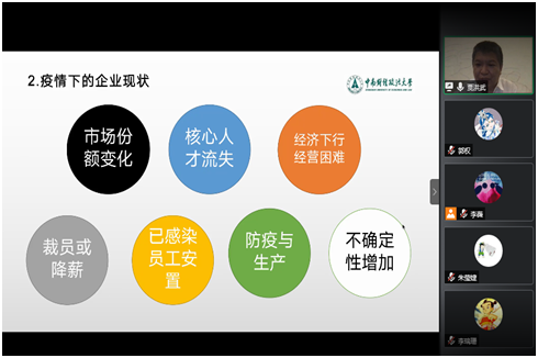 贾洪武主任以一个案例为切入点,引导学生们思考企业应如何对待新冠肺炎康复员工。以此为基础,贾主任简要介绍了国内外员工帮助计划(EAP),分析了疫情下的企业现状,聚焦了员工的心理与绩效,阐明了企业的EAP实施对策。讲座中,贾主任还具体谈及了由于受疫情的影响,企业经营困难,许多员工面临被裁员的风险、陷入恐慌与焦虑、员工的工作绩效也可能受疫情影响而下滑、湖北籍员工遭受歧视、生活水平降低等等问题。疫情所带来的种种不利影响使得开展EAP成为必要,贾主任对此提出了诸多建议来帮助员工及家庭从疫情创伤事件中恢复。