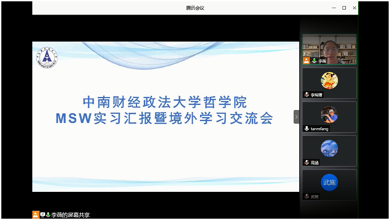(学生记者李瑞珊)2020年6月8日下午,中南财经政法政法大学哲学院MSW实习汇报暨境外学习交流大会在线上腾讯会议室举行。本次活动主要分为实习汇报、境外交流经验分享和19级实习动员大会三个部分,邀请了哲学院社会学学科负责人谭明方教授,2018级和2019级社会工作专业全体硕士生参加了会议。大会由我院MSW导师组李薇老师主持。