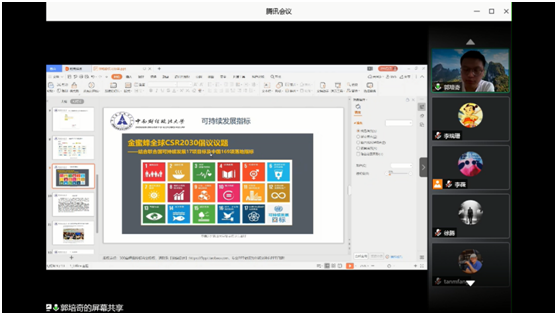 实习汇报环节,优秀实习生代表郭培奇根据自身的实习申请、实习内容、实习总结三个方面做了汇报。他实习的单位是责扬天下企业咨询管理有限公司。三个多月实习工作的内容主要是参与企业《金蜜蜂全球CSR2030倡议进展报告》的撰写,包括资料的收集与整理,文稿的撰写校对。他对于本次实习的收获有:提前体验工作状态,对企业社会责任方面有了比较系统的认识以及对企业社会责任方面的实际工作有了初步认识。他向大家建议要带着问题去参与实习,全身心的投入会收获很多。