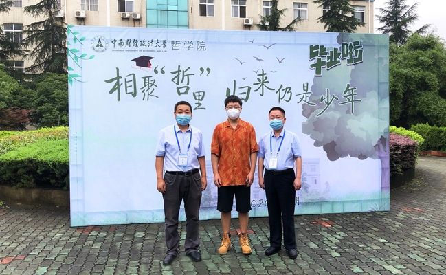 6月22日上午,哲学院社会学1601班本科生张禄浩从山东出发,经河北乘坐高铁返回武汉。一下火车,他拖着陪伴四年的行李箱,赶到文沛楼前,就看见了学院制作的欢迎毕业生回家的展板和早已等在楼下的学院老师。熟悉的老师、熟悉的文沛楼、熟悉的武汉,一切如故。