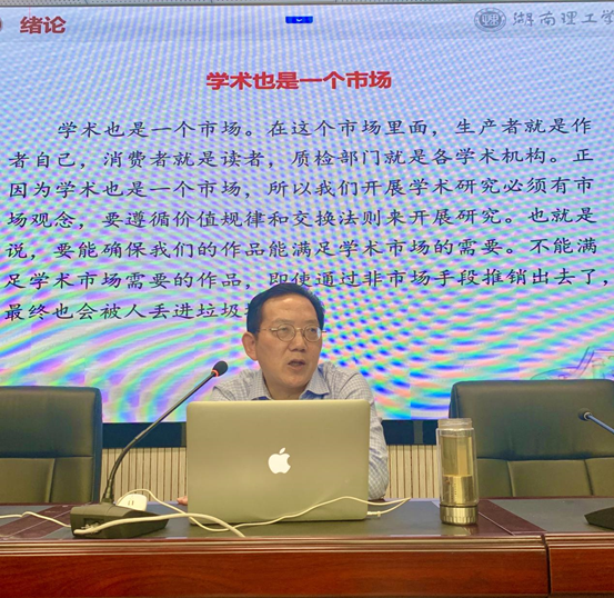 (学生记者 王雨萌 罗岩松)2021年5月21日下午3点,湖南理工学院期刊社社长、《云梦学刊》主编、湖南省青年骨干教师、中国伦理学会理事、湖南省伦理学会副会长、湖南师范大学中国特色社会主义道德文化省部共建协同创新中心首席专家彭柏林教授应邀在文沛楼二楼会议室进行了一场题为“学术论文写作与发表”的学术讲座。讲座由哲学系主任张佳副教授主持,哲学院2020级全体硕士研究生、博士研究生聆听了这次讲座。