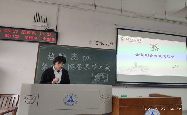 在换届竞选环节,各部门岗位竞选人一一上台发表竞选演讲,或用PPT演示,或口头演讲,表现出极大的热情。其他同学认真聆听竞选者的发言,并郑重地投下了自己的一票。最后,副会长进行发言,感谢老师和同学们对过去一年工作的支持,并对未来志协工作做出鼓励。希望全体同学继续坚定理想信念,认真学习,努力工作,争做时代新人,为学院和学校的发展、为祖国的繁荣昌盛做出应有的贡献。