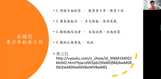最后,梁建雄主任聚焦后现代青少年社会工作,通过青少年问题的解构,帮助师生理解在青少年社会工作中如何运用后现代视角。他认为,后现代青少年社会工作应该突破负面标签、重发展能力、解放“被压迫者”和建构正面角色。