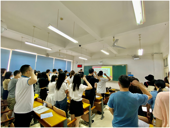 活动最后,广大团员面朝团旗,在罗岩松同学的带领下再一次紧握右拳,庄重宣誓:“我志愿加入中国共产主义青年团,坚决拥护中国共产党的领导,遵守团的章程,执行团的决议,履行团员义务,严守团的纪律,勤奋学习,积极工作,吃苦在前,享受在后,为共产主义事业而奋斗!”熟悉又庄严的誓词提醒着在场的每一位团员青年:铭记团员使命,不忘入团初心。在同学们热烈的掌声中,本次团日活动圆满结束。
