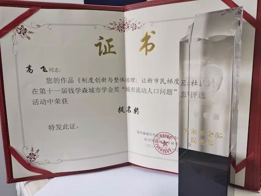 2021年11月2日,第十一届钱学森城市学金奖评选活动揭晓。我院教师高飞副教授的研究成果《制度创新与整体治理:让新市民梯度融入社区》获得第十一届钱学森城市学金奖提名奖。该奖项由杭州国际城市学研究中心发起,联合相关权威学术机构共同组织的学术评审活动。两院院士钱学森先生是城市学的倡导者,开辟了以系统论统领城市研究的全新领域。“钱学森城市学金奖”,又称“钱学森奖”“钱奖”以此纪念钱学森先生在城市学领域的开创性贡献,表彰和奖励国内对城市学做出突出贡献的集体和个人,推进中国城市学和城市研究事业的繁荣和发展。至今已有十一届,是目前城市学领域最具权威性奖项。