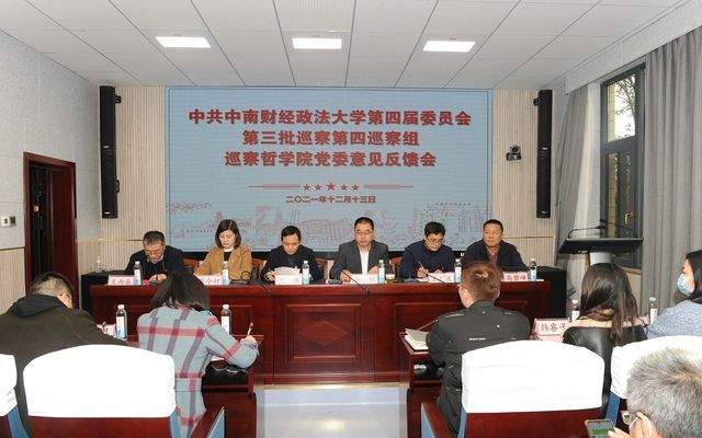 (通讯员 王路芳)2021年12月13日下午2:30,学校第四届党委第三批巡察第四巡察组巡察哲学院党委意见反馈会在文沛楼二楼会议室召开,第四巡察组组长代伟,副组长王广波、张今柯,成员王博、韩睿子、鲁雯;校纪委副书记、党委巡察办公室主任赵凯,党委巡察办公室副主任潘丰文,党委巡察办公室秘书刘一民;哲学院领导班子全体成员、学院教职工参加反馈会。会议由哲学院院长王雨辰主持。
