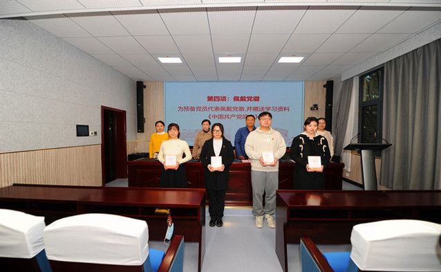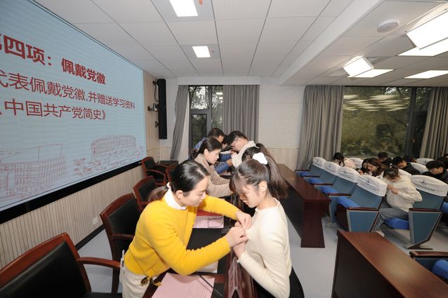 随后,在社会学2020级本科生徐金扬同志的领誓下,全体预备党员面向党旗,庄严宣誓。铮铮誓言表达着党员同志们对中国共产党的忠诚,为共产主义事业奋斗终身的初心和决心。宣誓完毕,与会领导老师为预备党员代表佩戴党员徽章,赠送学习资料《中国共产党简史》。
