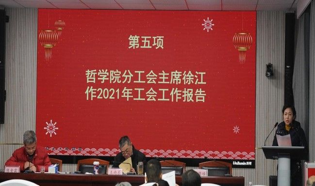校工会常务副主席余启军在致辞中充分肯定了哲学院工会过去一年所做的工作及成绩。他指出,哲学院工会全面落实校工会的各项规章制度和工作要求,加强民主管理和院务公开,充分发挥教职工的监督作用。积极开展各类文体活动,丰富教职工的精神文化生活,增强学院的号召力凝聚力。维护教职工合法权益,充分发挥服务和纽带作用。余启军表示,希望哲学院工会进一步加强对教职工的思想引领,为推进学院和学校的改革发展作出新的贡献。