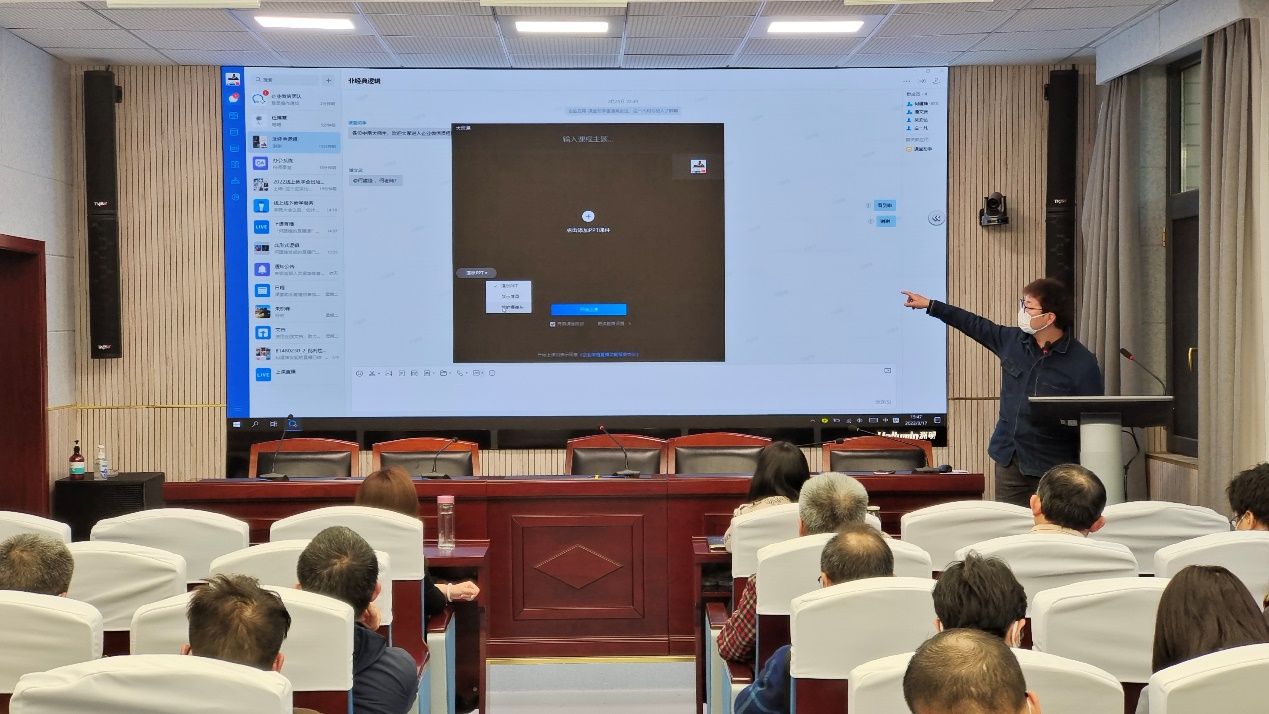 本次培训的第一项内容是企业微信课堂的使用,何建锋老师现场使用企业微信直观地为受训教师演示如何在突发疫情的情况下实现网络授课,并细致讲解了如何组建班级、分享课件、完成考勤。