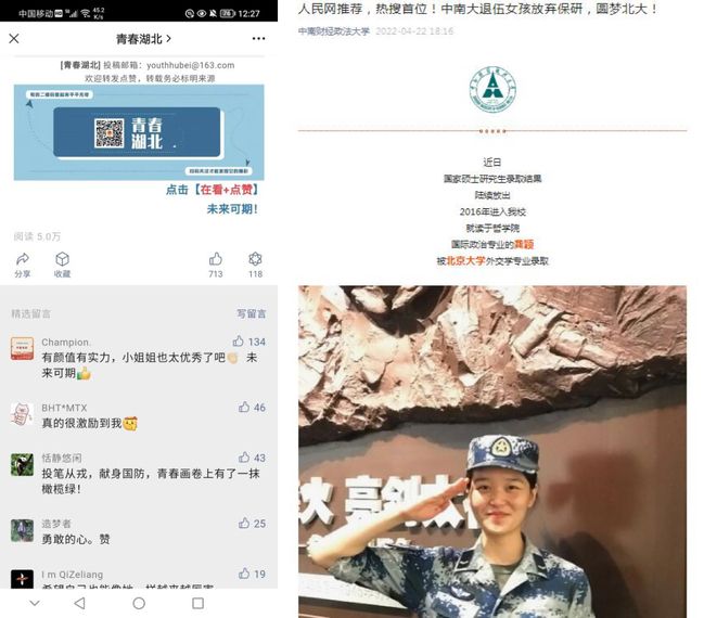 5.青春湖北,2022/4/24,《因为这个原因,退伍女孩放弃保研!》,链接:https://mp.weixin.qq.com/s/DsircL6xpI2hNDu4myTnHg