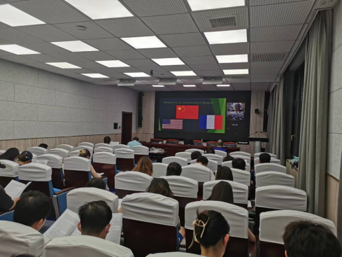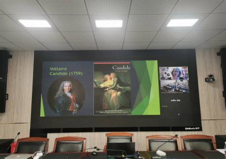 (通讯员:彭思思)2022年6月16日晚,米兰电竞·(中国区)哲学院“希贤人文大讲堂·海外名家系列讲座”第九场“法国文学:一种对人性的表达和反思”在文沛楼二楼会议室举行。受我院邀请,美国加尔文大学(Calvin University)教授、教员管理委员会主席、美国知名法国文学和文化研究专家、法国“学术界金棕榈骑士勋章”获得者约琳·沃斯-卡米(Jolene Vos-Camy)教授通过视频会议的方式为在场听众展开了一场法国文学之旅。讲座由王成军老师主持和翻译,哲学院副院长朱松峰、哲学系主任何建锋以及来自于哲学院、外国语学院的近五十名研究生、本科生参加了此次讲座,外国语学院法语专业的周巍老师担任本次讲座与谈人。