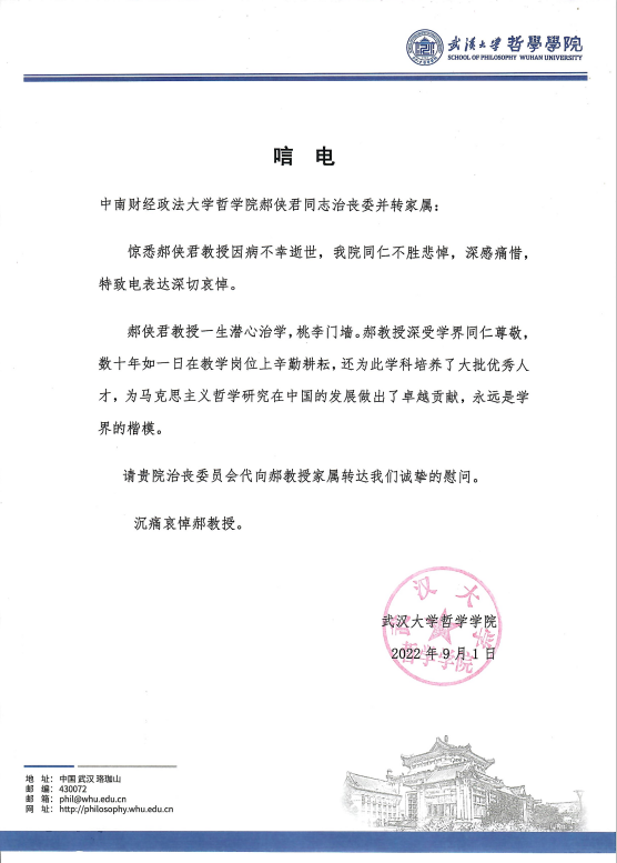 武汉大学哲学学院唁电