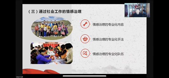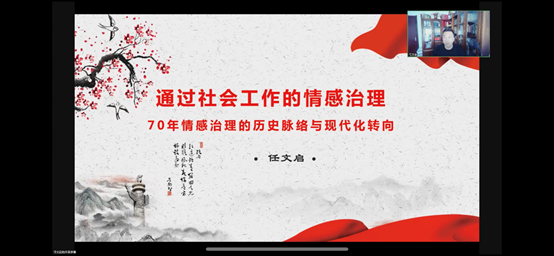 任文启教授从新中国成立73年以来社会治理现代化的背景出发,通过社会治理的现代化转向和中国社会工作的情感治理两条主线展开,探讨了社会治理的情感维度、情感治理的中国特色、中国70年基层社会情感治理的历史脉络与总体特征、情感治理的现代化转向与通过社会工作的情感治理问题。他强调,在基层社会的治理实践中,情感治理有着由来已久的历史和丰富而独特的实践内容,中国特色情感治理与中华文化传统一脉相承,与革命、改革和建设的国家治理进程相互交织,在社会管控、社会管理和社会治理三阶段中有各自的特点。